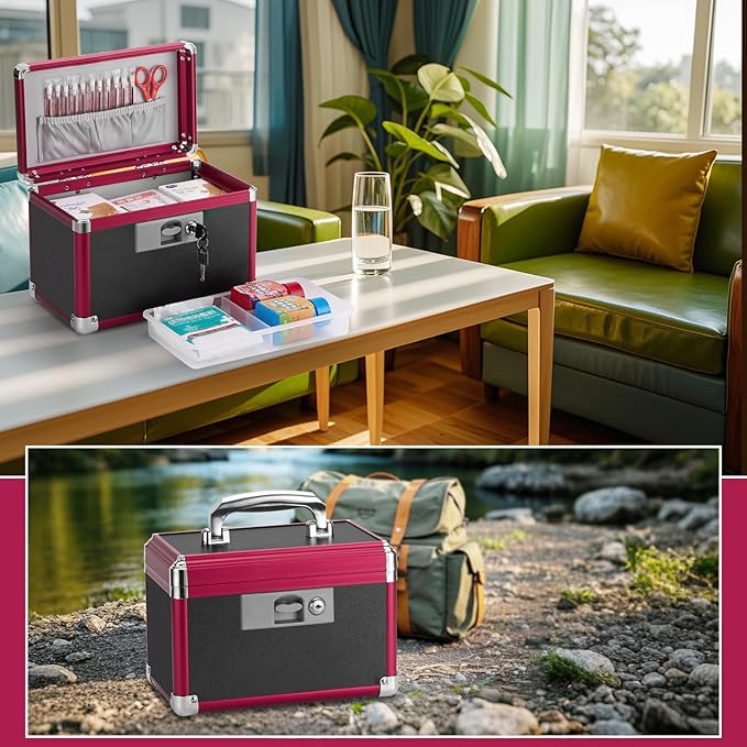 - PERFECT SIZE: Measuring 10 x 6 x 6.7", black & red, unique lock with 2 keys. our locking medicine box can store up to 8-10 pill bottles or any other small first aid