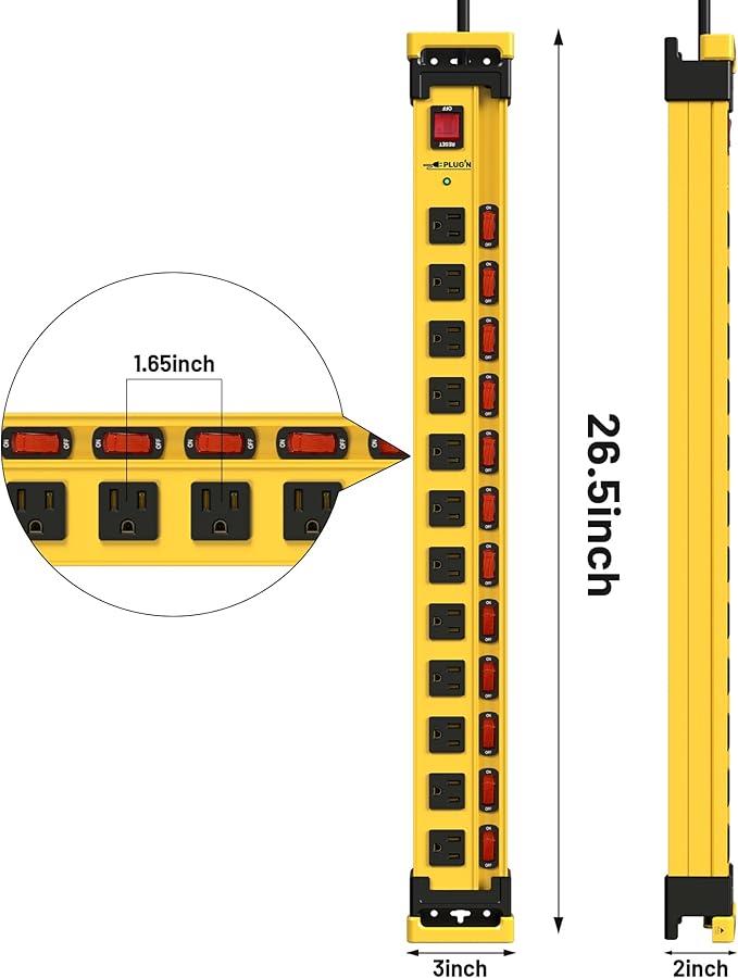- Large Power Strip--AC 15A 125V 60HZ 1875W, perfect for charging various electric tools in the workshop,garage,commercial,shop,home,kitchen,factory,workbench, industrial, under cabinet, warehouse and office.