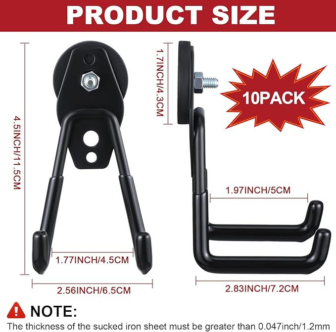 - Easy to Install: no need to use any tools, and the magnetic hooks will not break the surface; The black magnetic hooks can be placed directly on the metal surface; Please note that the thickness of the sucked iron sheet must be thicker than 0.047 inch/ 1.2 mm; Or else the magnetic hook will slide off