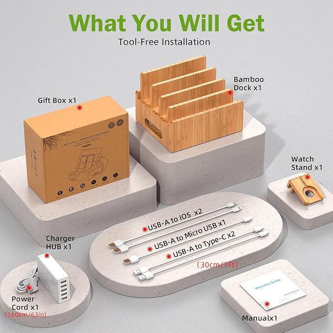 - WHAT YOU GET: 1 Bamboo Charging Station , 1USB Charger and Cord, 5 Cables(Included 2* 1OS cables, 1* Android cable, and 2* Type-C cables). One piece of USB Charging HUB(5Ports), and CORD, an extra Hanging Stand for Smart Watch, and 5 Charging Cables (1Ft). All these fit perfectly in the charging dock