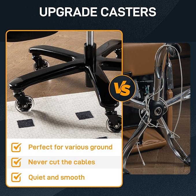 - 【Upgrade Bearing PU Casters】Compare to plastic casters, this chair equipped with 360 swivel rubber casters. The casters are more aesthetics, quieter and smoother. Perfect for wood floors, carpet, or tile, they won't affect your coworkers at work or your sleeping baby.