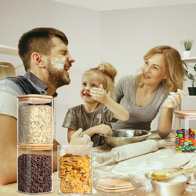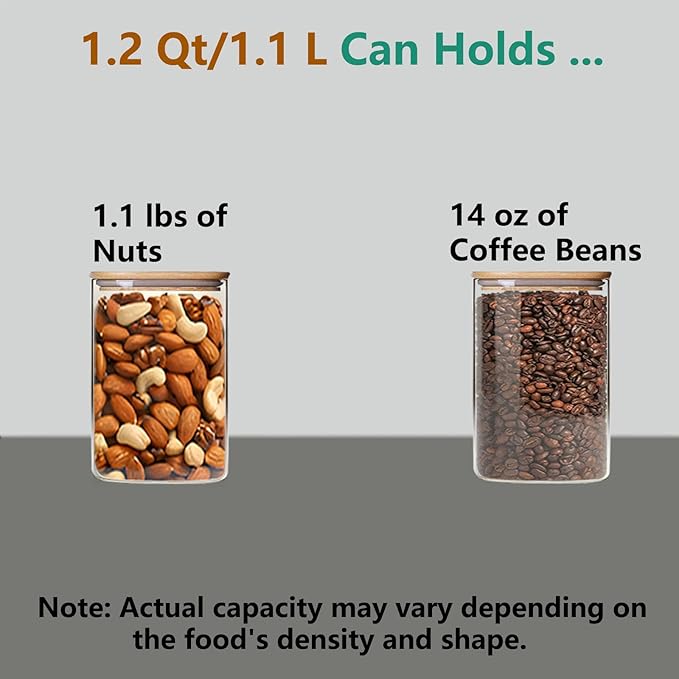 - [Safe to Use] The airtight canisters set is made of food-grade high borosilicate glass, lead-free, non-toxic. The lid is made from natural bamboo, adding an aesthetic touch to practicality. The glass is dishwasher-safe, but we recommend handwashing the lid for optimal care.