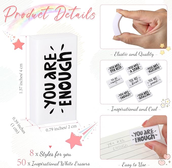 - Enough Quantity and Various Design: the back to school erasers package includes 50 pieces of inspirational white erasers in 8 different texts, cool and eye catching, enough for you to use and replace, and you can also share with students, teachers, office workers, and others