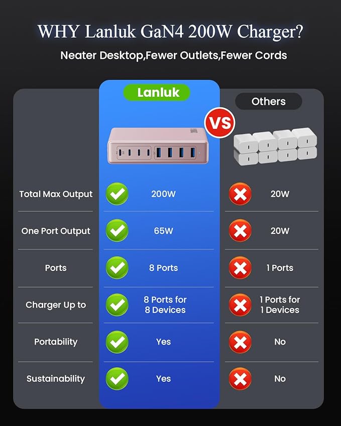 - 【2024 Super-Fast GaN IV USB C Charger】The Latest Design USB Charger with 200W Total Power and Multiports, adapted GaN IV generation chip technology, higher resistance to radiation, longer-lasting life, upgraded heat dissipation, faster, smaller and safer without sacrificing a drop of power. The usb ports upport advanced PPS,PD3.0 and QC4.0 technology. It built-in advanced intelligent controlling IC and multi-protection safety system to ensure safety for you and your devices.