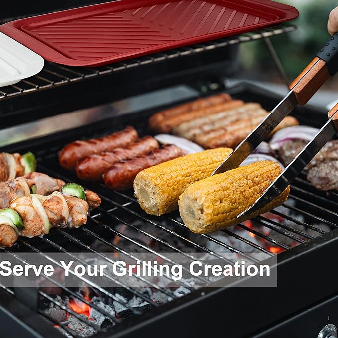 - SET OF 2 GRILLING TRAYS: Put the raw meat on the white tray and the completed and grilled items on the red tray, 100% cleaning to use each time
