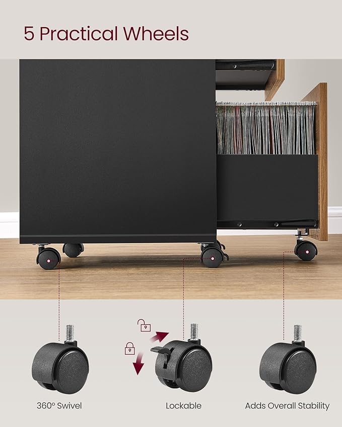 - [Lockable, 360° Swivel Wheels] Five 360° swivel wheels allow you to move this filing cabinet around with ease. The 2 front wheels are lockable to keep the cabinet in place when stationary and the fifth wheel on the bottom drawer adds to overall stability