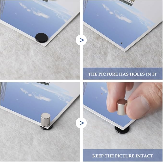 - 【Easy to Use】 You just push the pins into the wall with your hands, next position your photo, poster etc. that you want to hang, then hang your item by attaching the magnet to the outside