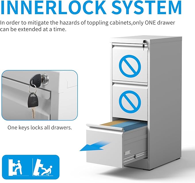 - 【Secure Locking System】This white file cabinet comes with one security lock and 2 keys, securing all your files. You can lock all the drawers at the same time, ensuring confidential documents and valuables remain protected from unauthorized access.Engineered with an anti-tilting mechanism, this narrow file cabinet allows only one drawer open at a time.The interlocking system enhances stability.