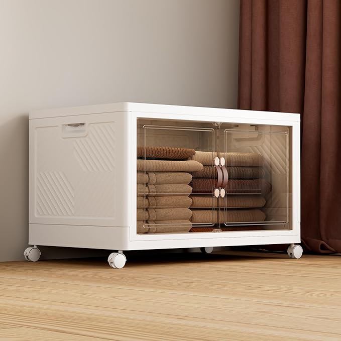 - [Easy to Move] The collapsible storage box is made of high-strength PP material, which is very durable. Four rotating wheels are installed at the bottom, so that it can move when cleaning, more convenient for you to clean