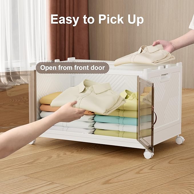 JOYMOOP Folding Storage Bins Organizer, 84 Quart Collapsible Storage Box with Wheels and Door, Stackble Plastic Storage Container for Clothing, Books and Sundries (XXL, 21 Gal, 1 Tier)