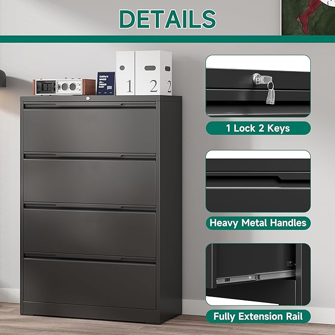 Metal Steel Filling Cabinets for Home Office - 4 Drawer Lockable Lateral File Cabinet for Hanging Files Letter/Legal/F4/A4 Size, Assembly Required - Black