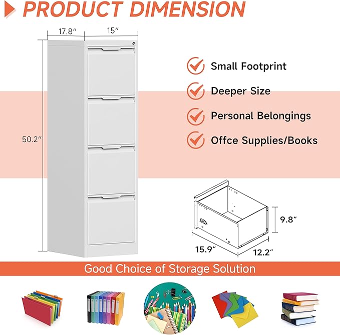 - ◉【Larger and Deeper Drawers】Office file cabinets 4 drawer with locks each drawer size is W12.2×D15.9×H9.8inches,Each drawers also equipped with 1 adjustable hanging rails , which can perfectly store letters, legal, A4 or F4 size folders to meet your different needs. Additionally, utilize the top surface to display decor or keep frequently used items within easy reach.