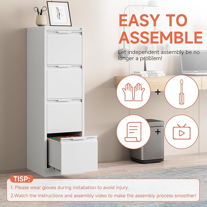 - ◉【Multifunctional & Stylish】Enhance your workspace with the sleek and modern filing cabinets for home office 4 drawer. Its clean and elegant appearance adds a touch of sophistication to any office environment. The drawer of each metal file cabinet with lock has a slot for display labels.High-quality ball bearing glides ensure a lifetime of silky smooth opening and closing over many years.