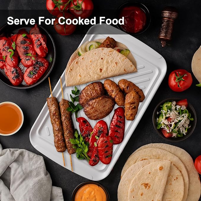 - Good Orginazation for Grill: This serving platter set includes a blue and a white tray, one for raw foods and another one for cooked food, Tray with a confortable handle perfect for a transporting food from the house to the grill.