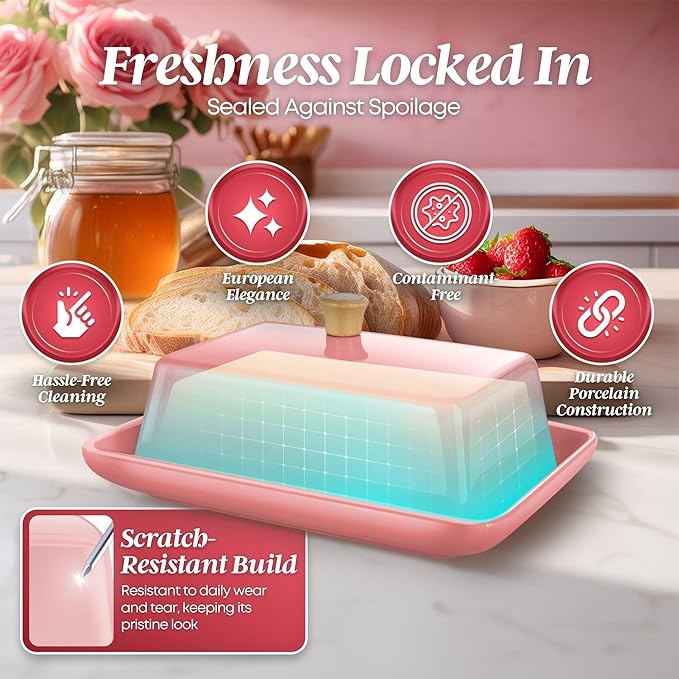 - Pure and Safe: Crafted from contaminant-free pink porcelain, this European butter dish ensures your butter is not just stored but preserved in a wholesome manner