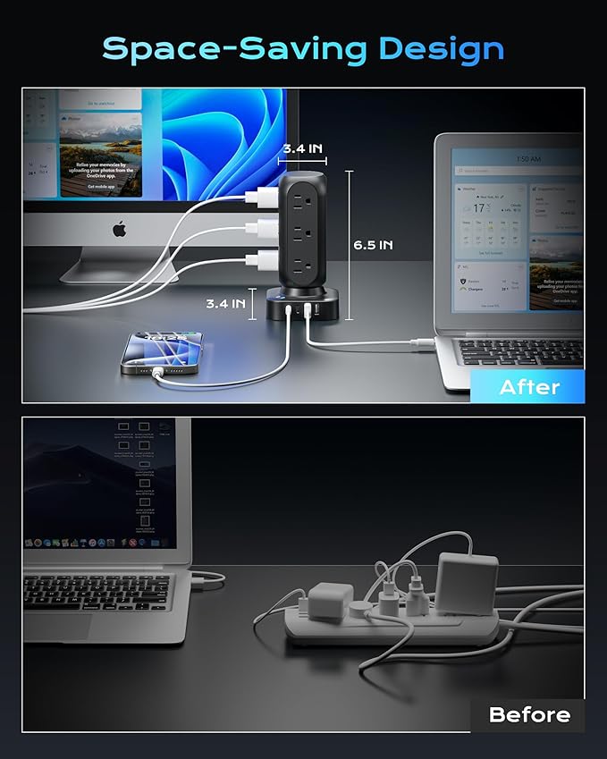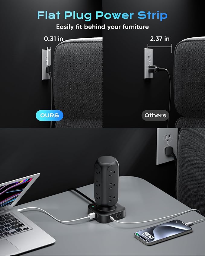 - 【20 IN 1 Power Strip Tower with USB】- This vertical power strip with USB ports features 12 AC outlets and 8 smart-charging USB ports(2 PD 20W USB-C).It can charge 20 devices simultaneously without blocking, keep your desktop organized, widely use in home/office/dorm room. (Note: Please do not exceed the rated power 1875W ).