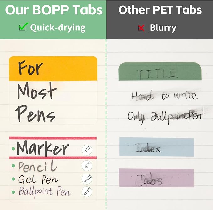 - Water-Resistant: Crafted from high-quality, water-resistant BOPP material, these index tabs ensure durability and withstand everyday use, self adhesive part is transparent