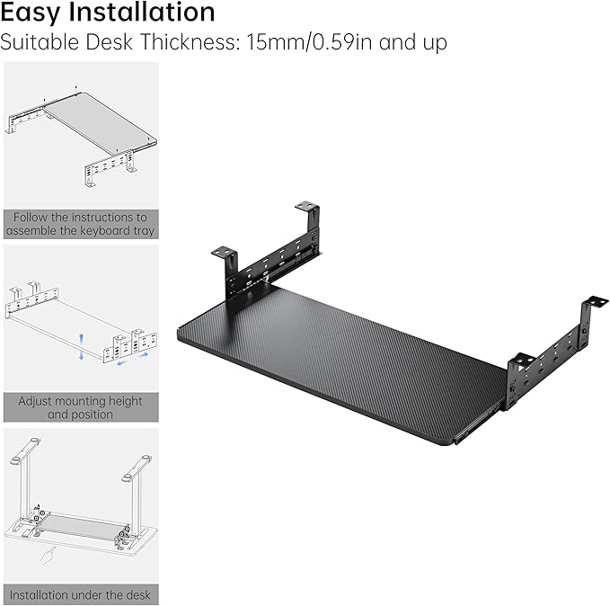 - 【Wide Compatibility】: This keyboard drawer is designed to be compatible with a wide range of desks, and is suitable for desktops made of materials such as wood, MDF, or other materials with similar characteristics (not compatible with plastic, stone, glass, etc.). The keyboard shelf can be easily mounted under the desk for flexibility in adding desktop space. Note: Make sure your desk is at least 43.31 x 15.75 x 28.74inches (L*W*H), and the desk is at least 0.59 inches thick. Please double check the size and whether there is enough leg room after installation before purchasing.