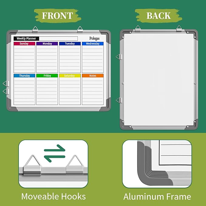 - Durable & Portable Calendar Whiteboard: Dry erase calendar for wall with aluminum frame is solidly built, not easy to scratch or break. Featured with stain resistant surface, you can erase for countless times without any smudgy ghosting or staining. The movable hanging hooks can be adjust the hanging distance, allows you to set up your dry erase board calendar either horizontally or vertically. Small portable white board is lightweight, it is suitable for handheld as well.