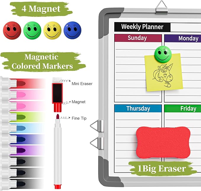 - Large Size & Value Package: The enlarged 16 X 12 inches stylish dry erase calendar board has perfect size, can be used as a monthly planner, weekly planner, schedule, message or memos board! White board calendar dry erase set comes with 10 pcs magnetic markers (include 7 color), 4 pcs magnets, 1 pcs dry eraser. Extra 4 pcs sticky hooks and 4 pcs hardwall hooks help hang on the wall, no need to buy a bunch of accessories. TIP: Please peel off protective film on both sides before using.
