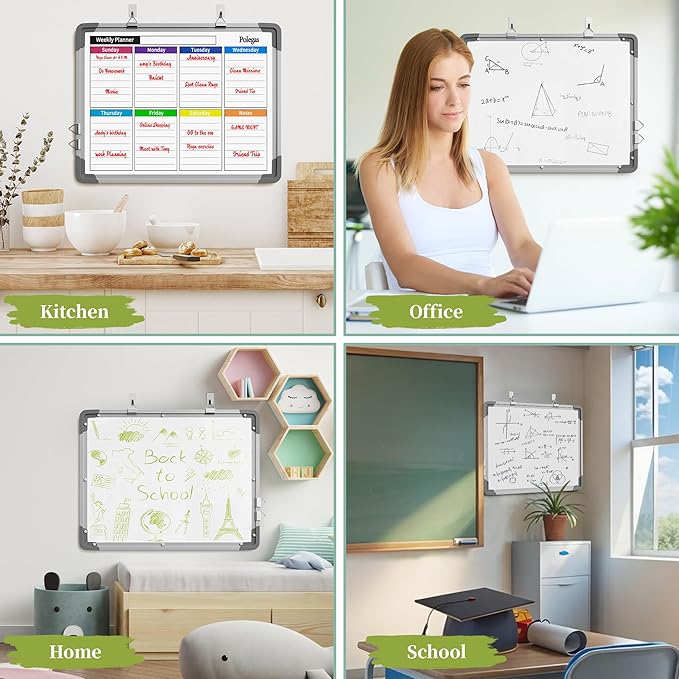 - 2 in 1 Dry Erase Board: The magnetic whiteboard calendar have double-sided design, allowing you to have two projects going on. The front side is printed with an undated monthly calendar grid, you can write down dates, monthly schedule and make to do list plans. The other side is blank, it is perfect for school home teaching or memo, you can hang on the wall to jot down upcoming events, deadlines, appointments, projects, and important reminders.