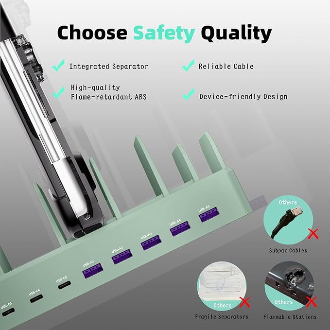 - Sturdy One-Piece Slots: Unlike other charging stations that use fragile, removable dividers, our multi-port charging station features a durability design made from high-quality, flame-retardant ABS material, ensuring a longer lifespan. We’ve specially designed two extra-wider and taller slots in the middle, each measuring 1.57" wide and 1.77" high. These slots are perfect for securely holding a laptop or a child's iPad with a protective case intact.