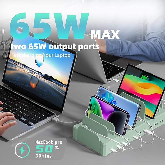 - Fast GaN Charging Dock: This multi device charging station equips PD ports for apple devices, to power your smart gadgets with high speed. You can charge your laptops like Macbook series with the top two 20V/3.25A fast charging power. Additionally, three 30W ports and five 20W ports make it perfect for fast charging iPhones, Galaxy S23/Ultra, headphones, Kindles, iWatches, Switches, and more, meeting all your daily charging needs.