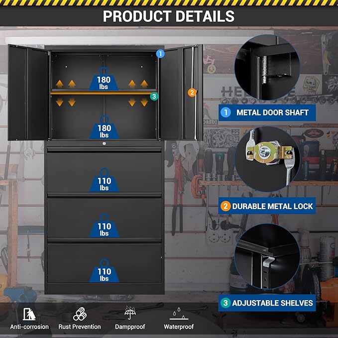 - MULTI-FUNCTIONAL AND DURABLE - The whole cabinet is all made of metal, and the metal shelves above the cabinet can bear about 180 pounds of weight; The metal drawer below can hold about 110 pounds.You can put it in different places such as office, living room, garage, warehouse, etc. It can completely meet your needs.