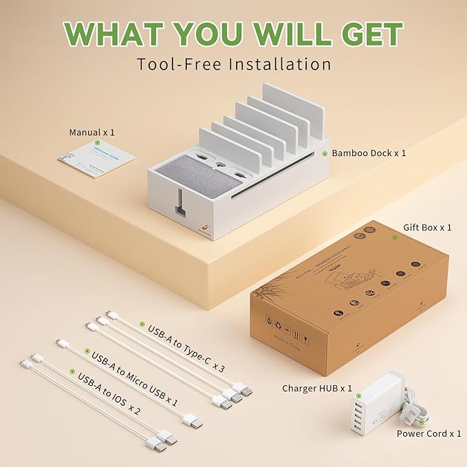 - What You Can Get: 1 x Pezin & Hulin Bamboo Charging Station, 1 x 5-Port USB Charger HUB & Cord, 6 x Short USB Cables (3pc Type-C, 2pc for lPhone & lPad, 1pc Android) for your daily use, 1 x user manual