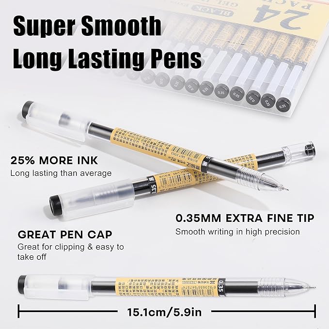 - Fine Writing Experience:This set of 24 bulk(15 black+5 blue+4 red), 0.35 mm thin lined gel pens with ultra fine point pen offers smooth writing, similar to premium rollerball pens. Ideal for bullet journaling, art projects, and office/school note taking, great for calligraphy lovers and journaling enthusiasts, ensuring neat lines.