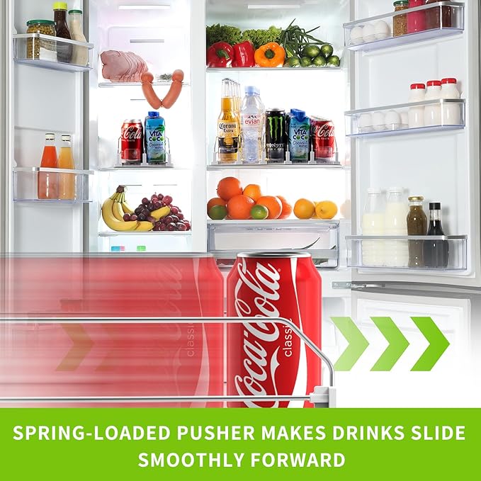 - [Convenient Design] The soda can organizer for refrigerator features an integrated spring pusher design that automatically and smoothly slides your drink forward. This ensures that your drink is always prominently displayed for easy access
