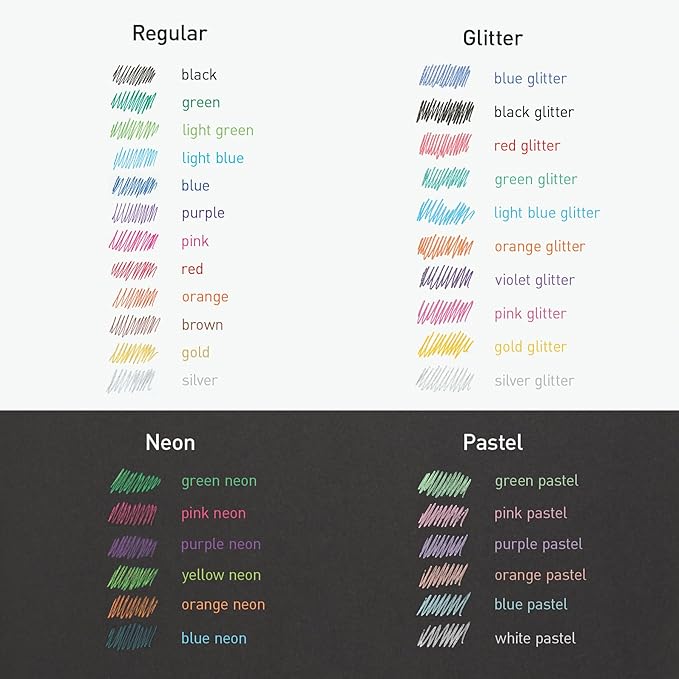 - This Pentonic multicolor gel pen set comes with 36 pens in 36 different colors: classic, neon, pastel, and glitter
