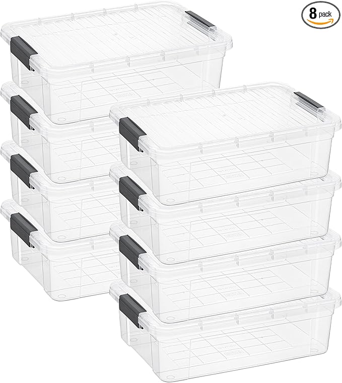 Superio Clear Storage Boxes with Lids, 13.7 Quart Plastic Container Bins for Organizing, Stackable Crates, BPA Free, Non Toxic, Odor Free, Organizers for Home, Office and Dorm, 8 Pack