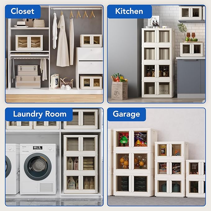 FLEXIMOUNTS 152 QT Stackable Storage Bins With Lids, Collapsible Plastic Storage Bins, Closet Organizers and Containers with Doors and Built-in Wheels For Home, 2 Pack Cubes, Milky White