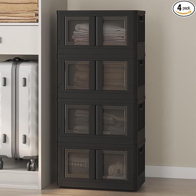 FLEXIMOUNTS 150 QT Stackable Storage Bins With Lids, Collapsible Plastic Storage Bins, Closet Organizers and Storage Containers with Doors and Built-in Wheels For Home, 4 Pack Cubes, Black