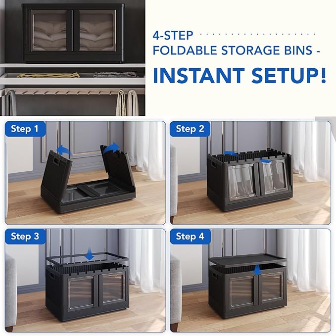 - Instant Foldable Storage Bins With 4 Lids: Each storage bin comes can be used independently. These 150 QT collapsible storage bins with lids require no tools for installation and can be ready for use in as little as 10 seconds. When not needed, they can be easily folded and stored under the bed or couch or in any corner, taking up very little space.