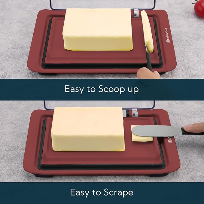 - Easy to Scoop up & Easy to Scrape:Have side stoppers to wipe off the excess butter and rest the knife. The stoppers at both ends of the clear butter holder help you easily scoop up butter. Slide the knife up the stopper and use the top of the stopper as a scraper to remove the remaining butter and clean your knife