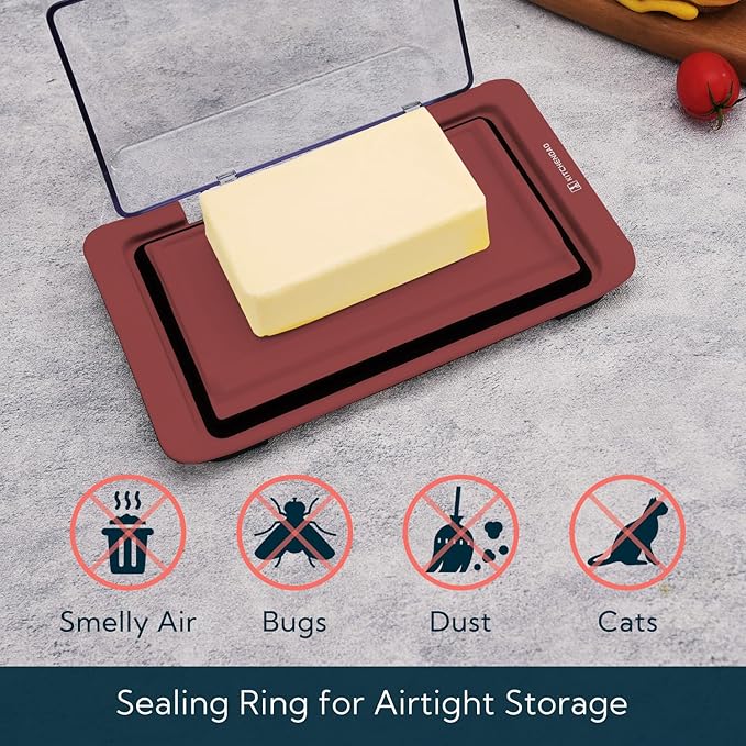- Sealing Ring to Keep Butter Fresh: With a built- in sealing ring,this airtight butter keeper seals the freshness in and allows you to have soft butter out on the bar/ countertop all the time. It protects your butter from your cats, dust, bugs and anything else that might taint your butter