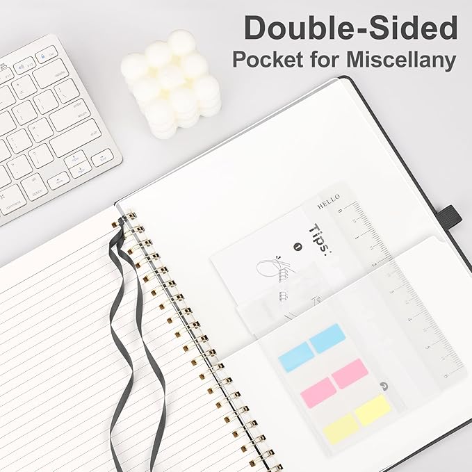 - PRACTICAL LAYOUT: Equipped an elastic band, a pen holder and removable bookmark ruler to keep your notebook organized. Comes with a DIY bookmark with a ribbon for self-attachment to the spiral, serving as a bookmark. Features a double-sided pocket for storing miscellany and 18pcs sticky notes for additional organization and reminders
