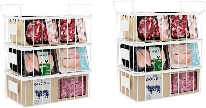 - 【Sturdy Metal Construction】The metal wire baskets hold heavier food not deformed,These stackable organizers are designed for long-term use in the refrigerator, the freezer storage can hold more heavy frozen food and prevent any scratching or tearing of bags or wrapping.