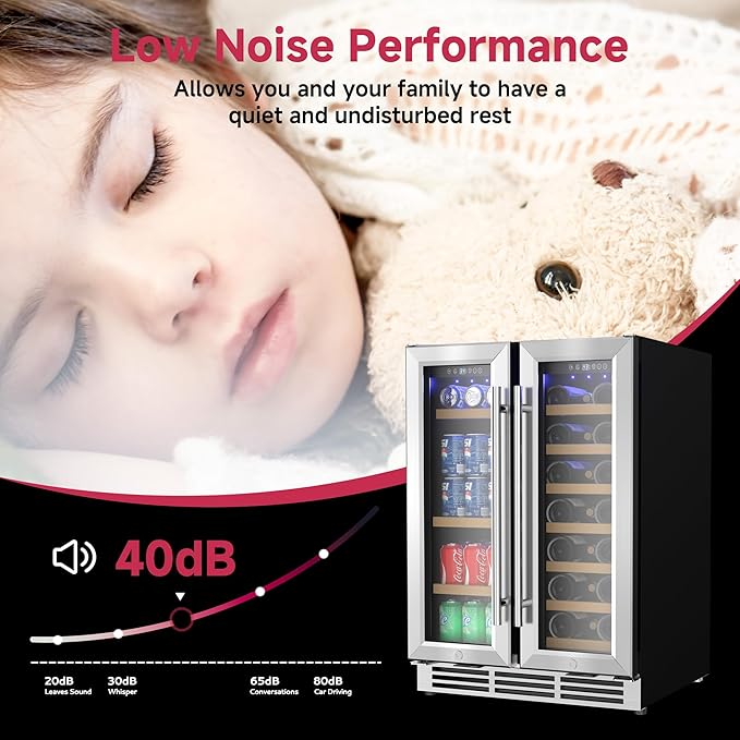 - Built-In & Freestanding - The undercounter refrigerator is set up with front vents, eliminating the need to worry about air circulation and heat dissipation, making it ideal for installation in a built-in bar area under kitchen countertops or freestanding units. Dual zone wine cooler measures 22.6"D x 23.4"W x 34.3"H (with handle). Beverage cooler automatically defrosts every 6 hours without manual intervention.