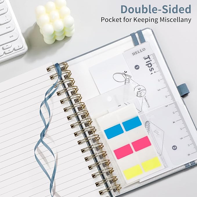 - All-Inclusive Design: Includes 1 DIY ribbon bookmark, 2 elastic bands, sticky notes, a removable ruler, PVC back pocket, pen holder, and rounded corners for portability