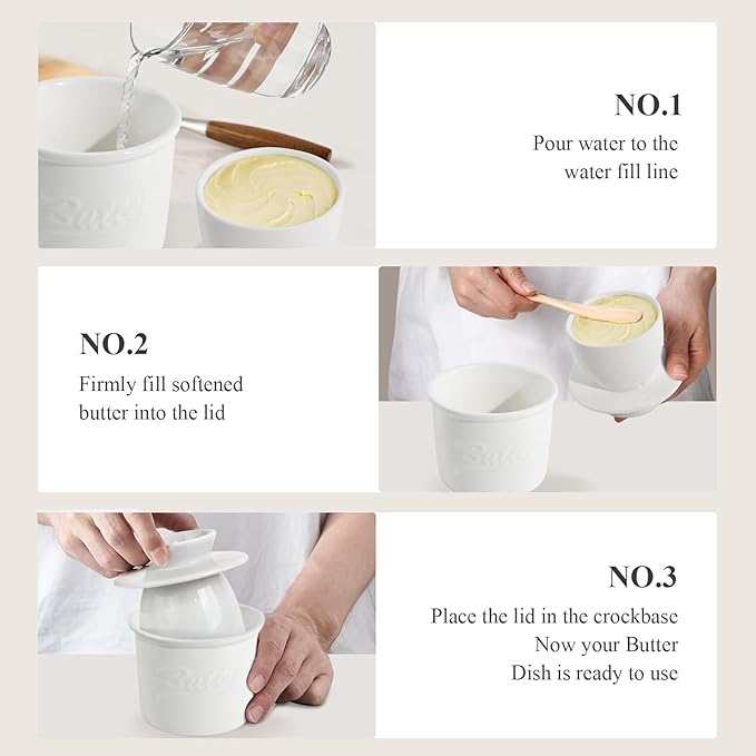 - GETTING RID OF EATING COLD BUTTER: If you love the soft taste of butter, hate hard and cold butter, and hate butter with a refrigerator smell. Don't miss this butter crock. This butter crock creates a sealed environment using water, keeping your butter fresh and flavorful at room temperature (up to 24°C, 75°F) for up to 10 days, without the need for refrigeration.