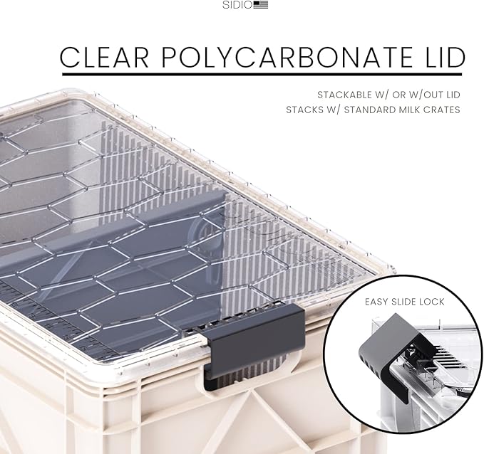 - RESISTS CRACKS, DENTS AND EXTREME TEMPERATURES. Camping, moving, or long term storage? The SIDIO crates can handle it all. Sturdy and reliable; with ergonomic handles for easy transporting, and an easy-slide polycarbonate lid that is transparent for effortless viewing of contents.