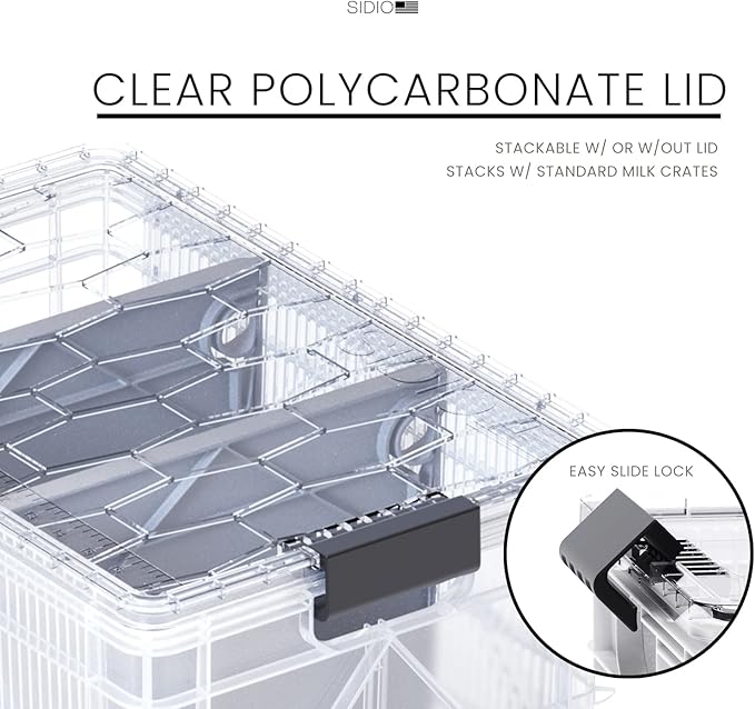 - WHAT'S INCLUDED: The SIDIO Pro Pack includes two full sized crates, one half sized crate, three clear lids, three black bottom mats, four standard dividers, and one long slotted divider. Full size exterior measures 18.5”x12.5”x 11” without Lid; 11.5" with Lid, while the half size exterior measures 18.5”x1 2.5”x 6.5” without Lid; 7" with Lid.
