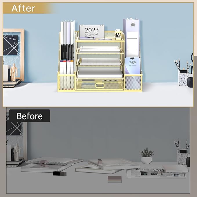 SUPEASY Mesh Desk Organizer with File Holder, 5-Tier Paper Letter Tray Organizer with Magazine Holder, Desktop Organizer and Storage with Drawer for Office Supplies Home or School, Gold