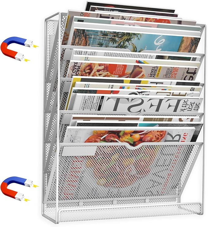 - Hanging Magazine Holder: 5+1 Magnetic file holder with 6 tiered file managers, each with a place to stick labels to classify your documents, and 1 flat bottom tray perfect for holding some office accessories to keep your desk or filing cabinet looking neat. Our package is equipped with mounting screws to meet your different installation needs.