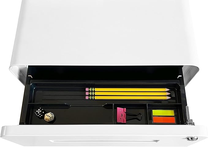 - Accessories included. Pencil tray and drawer divider included. Comes with both stationary feet and wheels. Two unique keys provided.