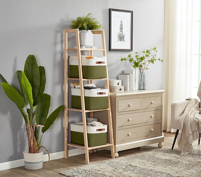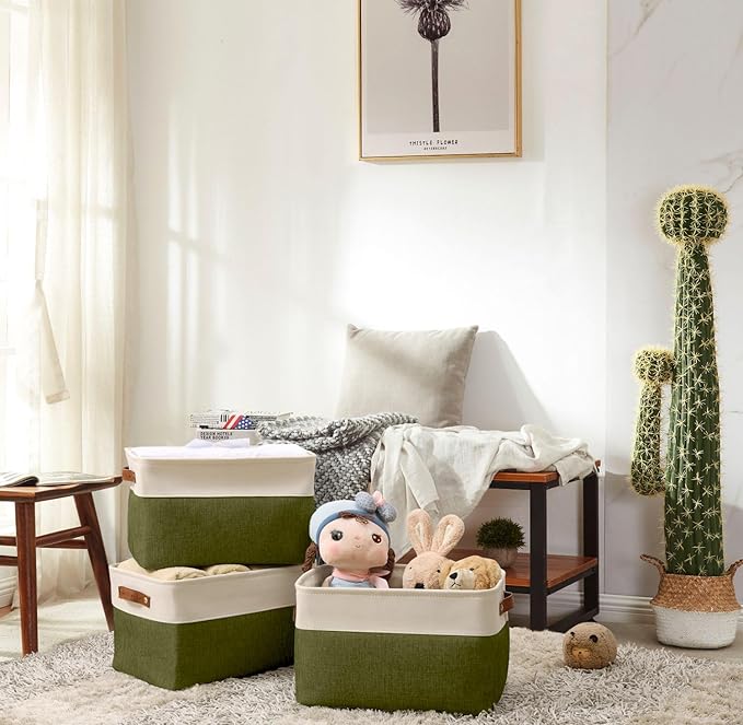 DECOMOMO Fabric Storage Bins - Storage Baskets for Shelves, Linen Closet Organization (Olive Green & White, Large - 3 Pack)