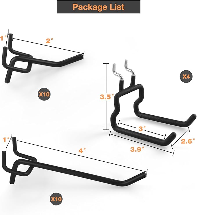 - No-Slip Hanging – The tilt-up end design prevents tools from falling, while the double hooks offer support for tricky items like skateboards or helmets. Keep everything visible and within reach, neatly displayed on your peg board.